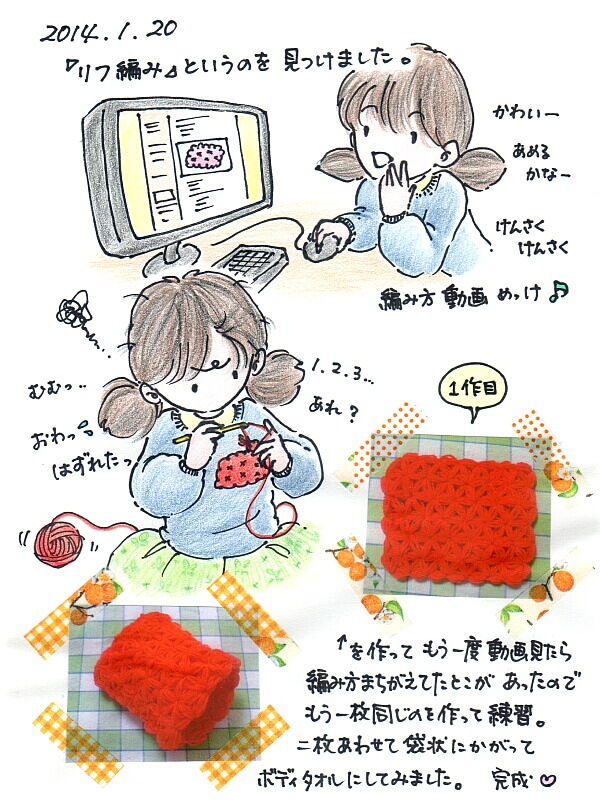 アクリルたわしを編むのに、私は極細のアクリル毛糸を好んで使うのですが、近くのスーパーなどには太い毛糸しかなくて、どこかで安く売ってないかなと思ってあちこち調べていました。そしたら何だか可愛いパターンの写真があって、「何これどうやって作るの?」とびっくりしたのがリフ編みというわけです。
